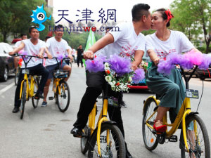天津网讯 每日新报记者信华 没有豪华车队,没有婚纱礼服,昨天下午,天津津南区出现一支别出心裁的迎亲车队,他们用的婚车很特殊——50辆共享单车。