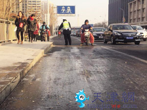 “前面有冰,慢点呀。有冰呀,较好下车推两步,别摔着。”耳边不停地传来操着浓重天津口音的提示。每每有骑车人经过,挡在冰面前方的这名协管员就会大声提示着,而骑车的人则会面露微笑,说一声“谢谢”。而这名协管员也会趁着车辆少时,回身用脚去踩踩冰面,看看冰是否还冻得很牢固。